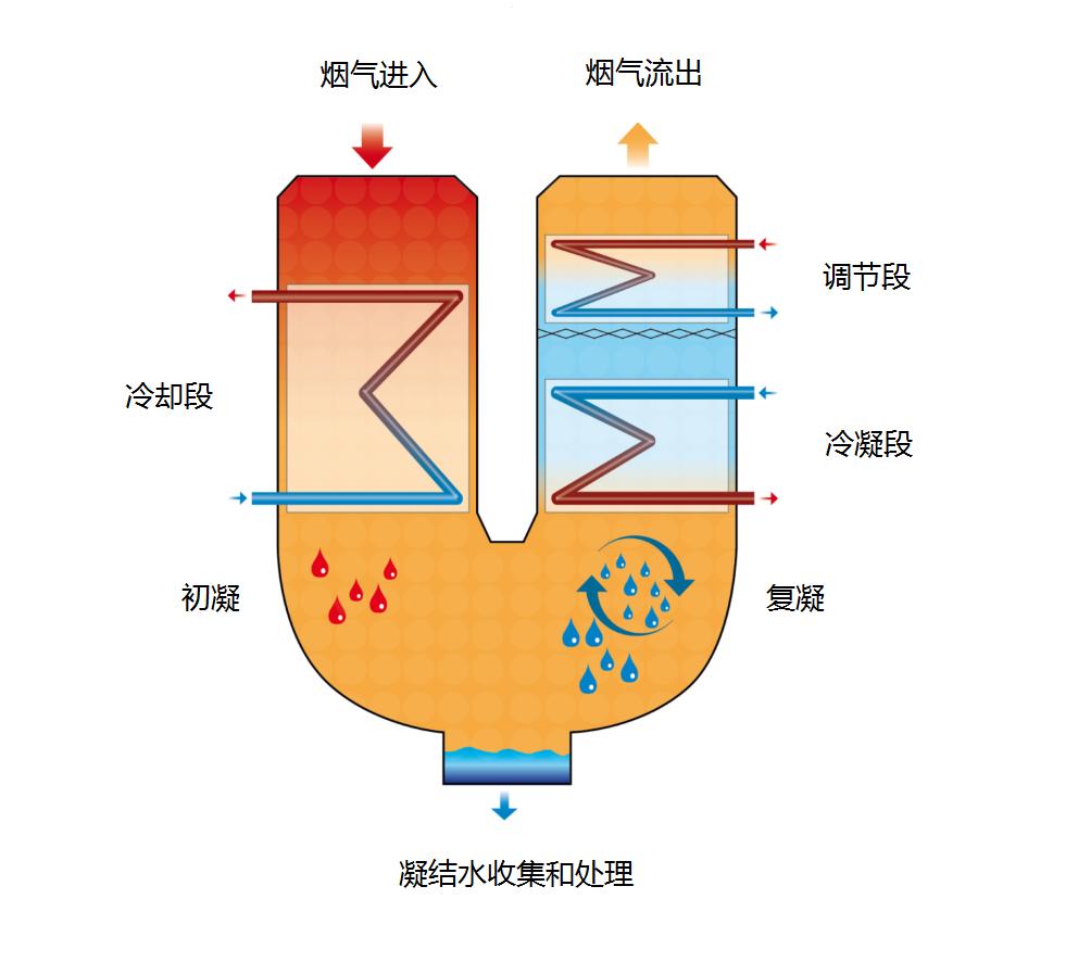 利用復合管換熱管內的冷卻水將煙氣降溫、冷凝,煙氣中的水分得以析出,匯集后回收利用。 使用系統提取回收的凝結水可以進入脫硫處理系統重復利用,降低脫硫處理工藝耗水量,提高水的利用率,節約全廠的水消耗,達到節水目標。