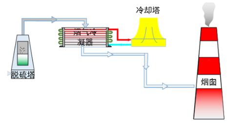 防堵抗蝕復合管煙氣冷凝器一般布置在脫硫塔后、煙囪前煙道,利用除鹽水(開式循環,余熱回收利用煙氣相變熱加熱除鹽水)或循環冷卻水(閉式循環,通過冷卻水塔冷卻)對煙氣進行冷凝,降低煙氣含水量,達到地方環保“脫白”要求。